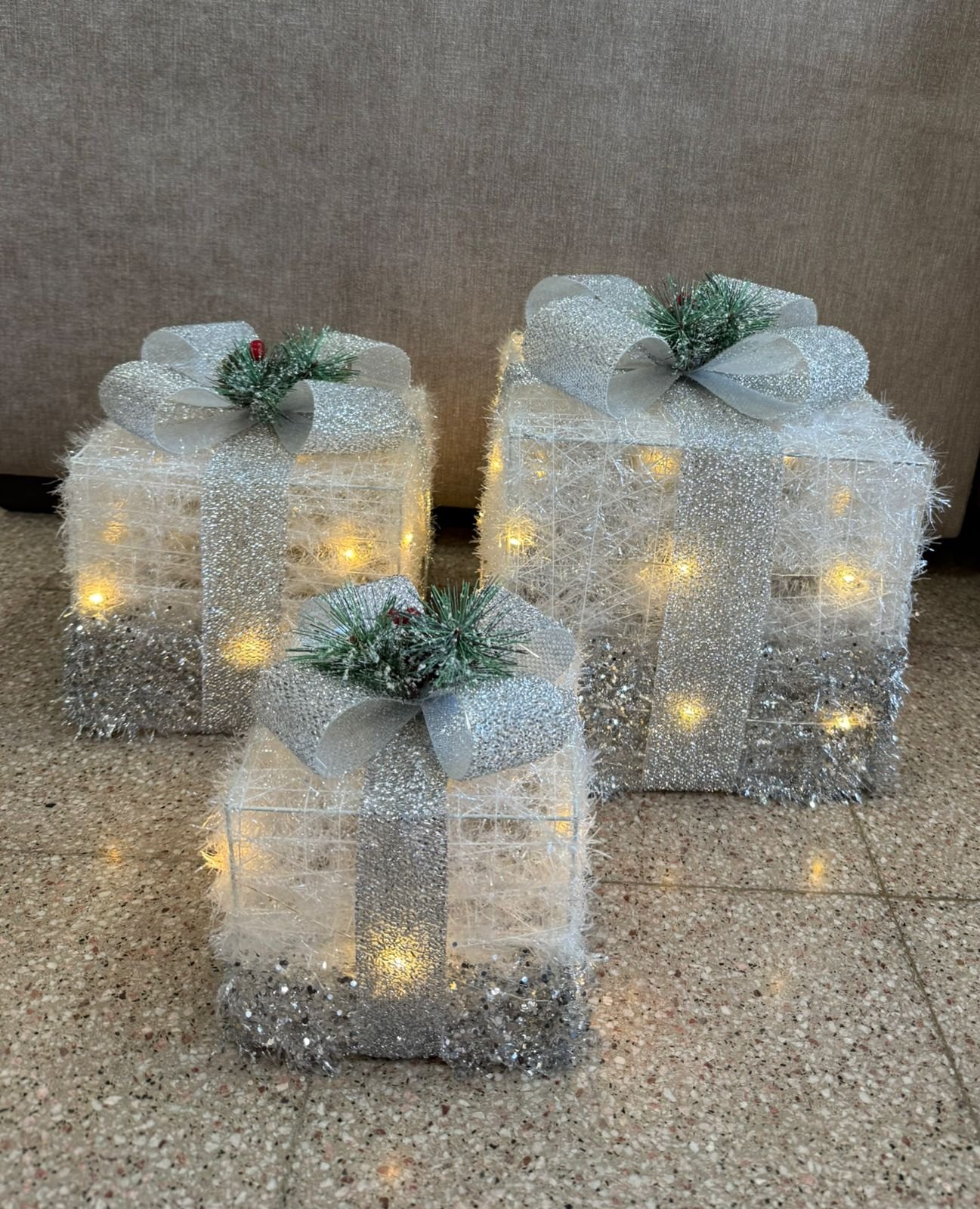 CAJA REGALO PLATA CON LUZ LED X3 – 15CM/20CM/25CM
